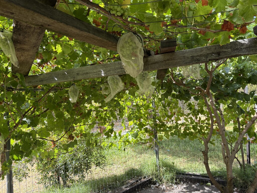 We have had a mix of weather so far this summer, with some heat but also lots of wind. Despite this, we have had some good growth – particularly our grapes that were planted around the ‘duckagon‘. They have really bushed up and now form a fabulous shady pen for the ducks, and there are lots of bunches of grapes too!