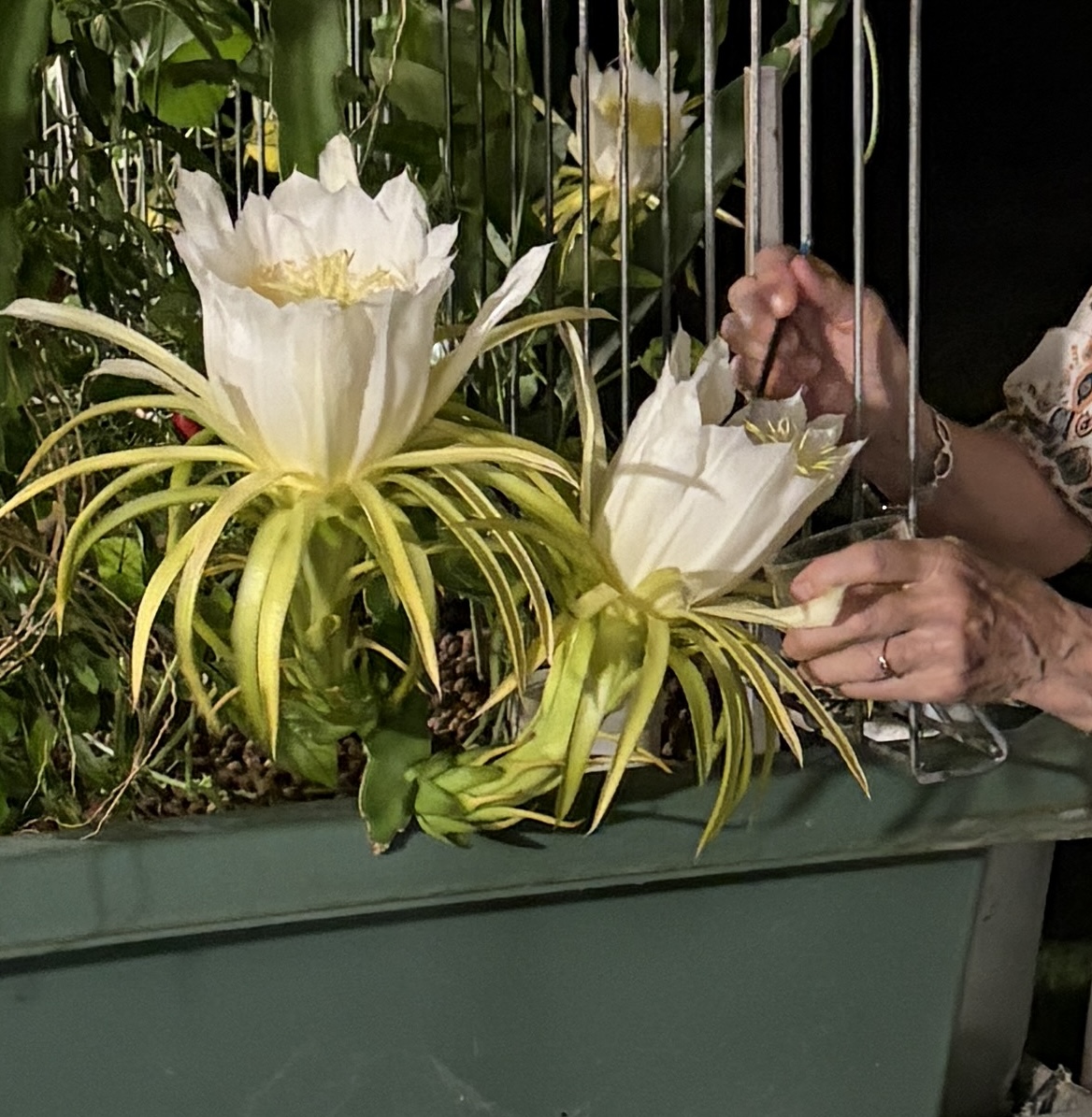 We hand pollinated each night, using a soft paintbrush by brushing the pollen off the stamens and the petals where it had dropped to, and then brushing it into the stigma. In our enthusiasm, we went out too early the second night and the pollen hadn’t yet been released, but when we went out a couple of hours later there was plenty of pollen on the lower petals we could brush up into a container.