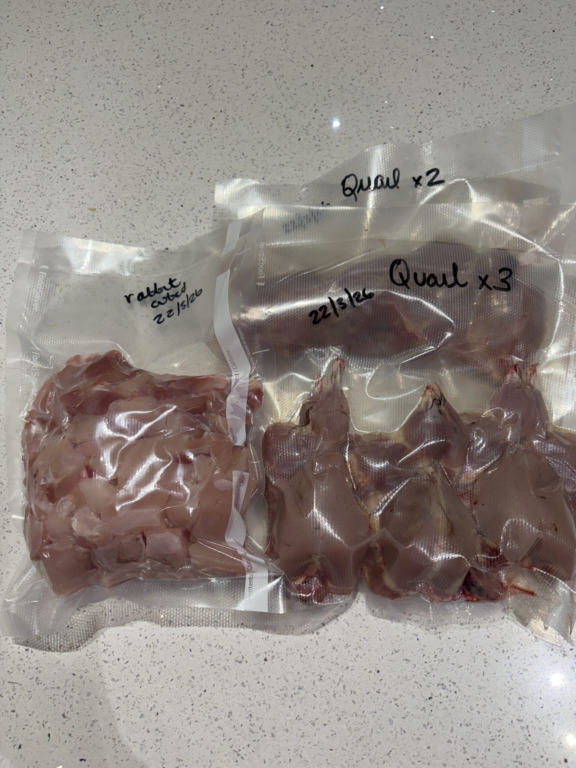 With the two lots of young quail doing so well, it was time to cull the older ones who were not laying much at all, but still eating! We now have a couple of quail dinners to look forward to, and while we were at it we also culled a rabbit and prepared it into cubes ready to make a delicious dinner!