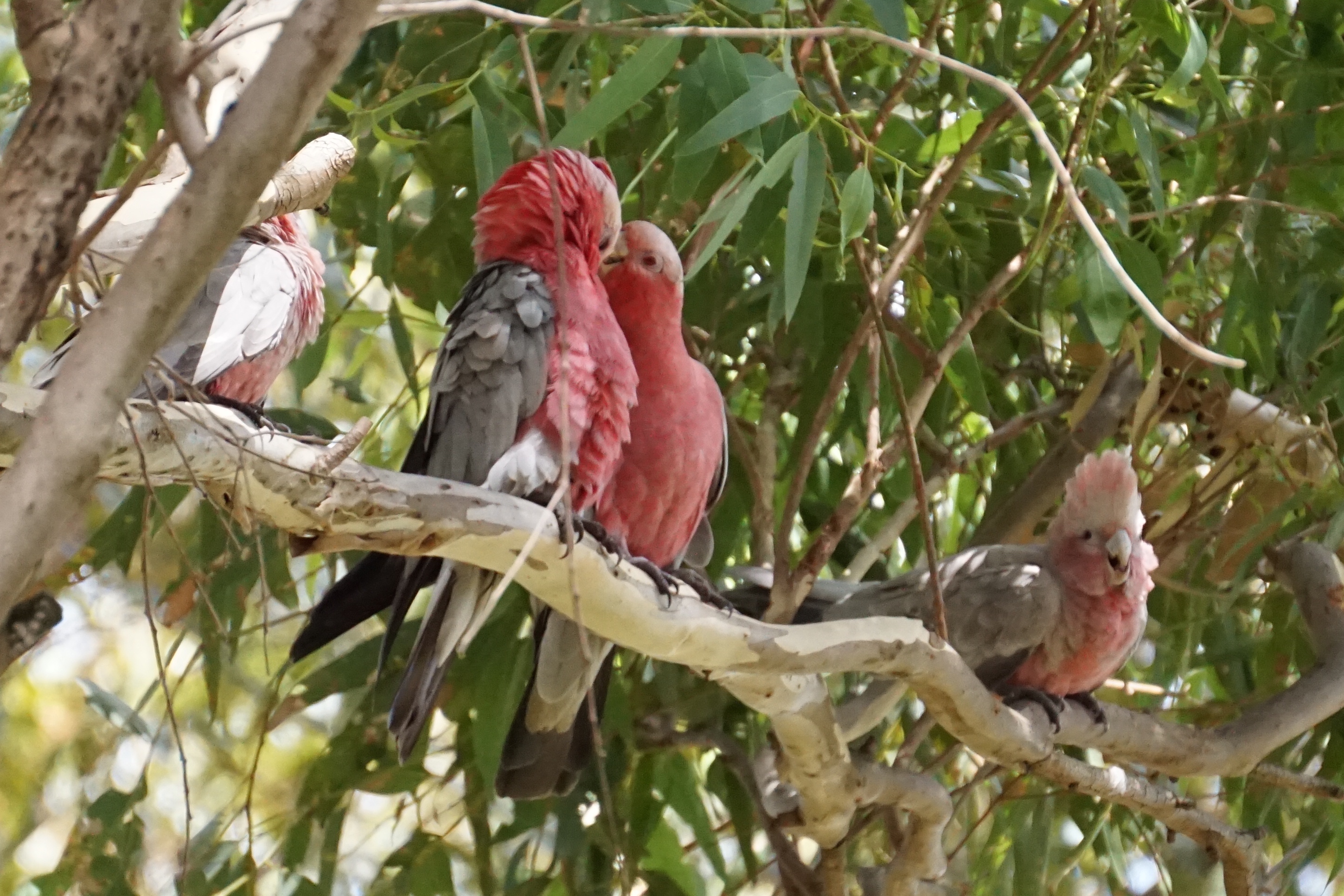 Galah protecting its nest from the rainbow lorikeets (one in the fork of the tree, one to the right)
